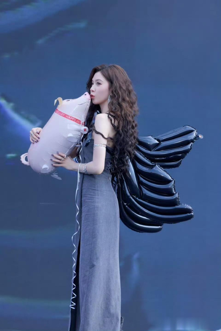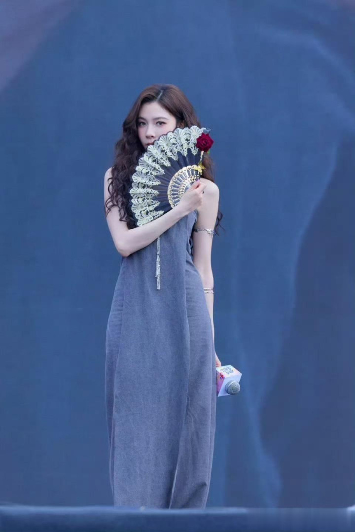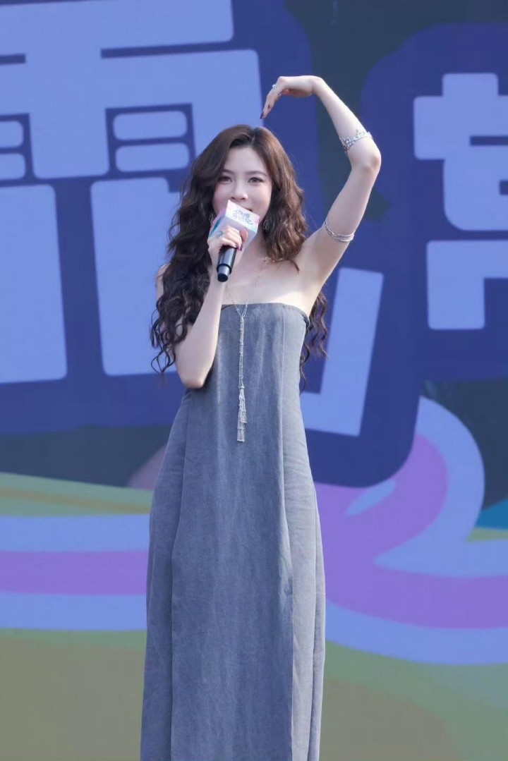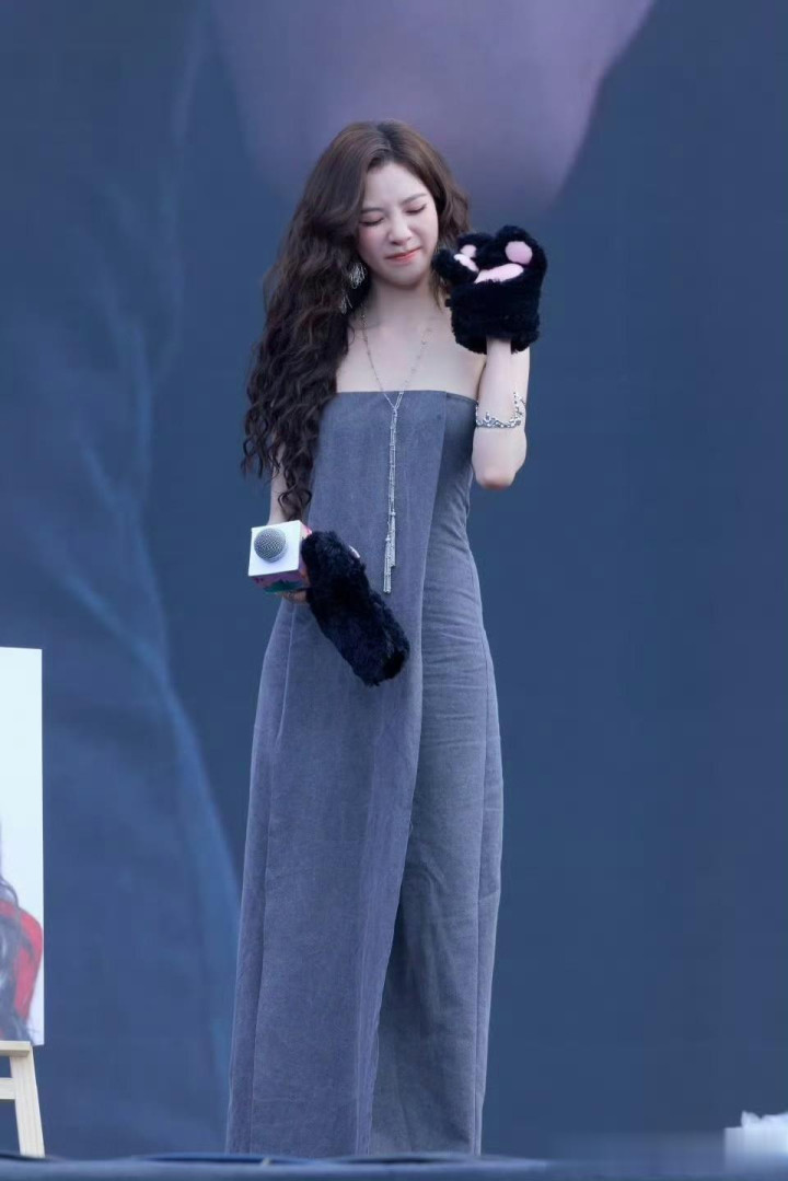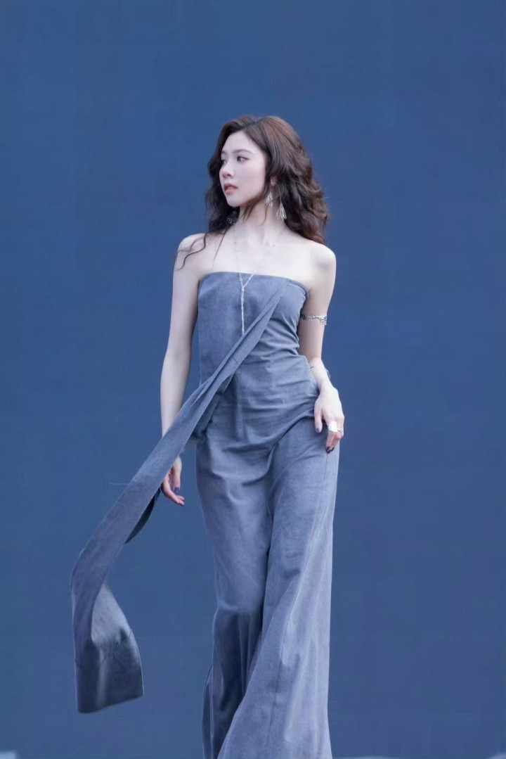 宋妍霏灰色抹胸裙造型, 又美又有氛围感!