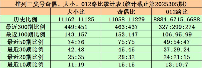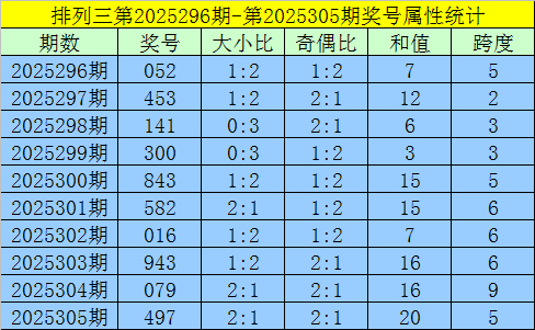 上期回顾:排列三第2025305期出现奖号497。开出组六,奇偶比2:1,012路比1:2:0,大小比2:1,和值20,跨度5。