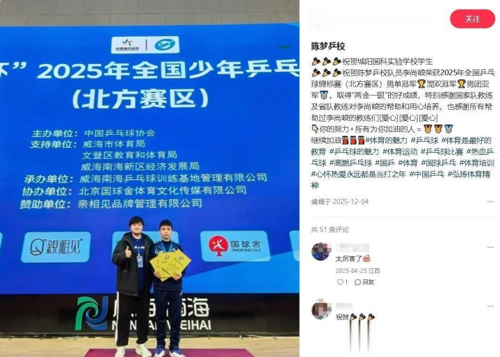 李尚峻的成功并非偶然。 他在山东完成启蒙训练后,进入陈梦乒乓球学校接受系统训练。 这所学校自创建以来,已有近20名乒乓小将在山东省及全国国青国少选拔赛中获得冠军。 截至2024年,已有三名学员入选国字号队伍。
