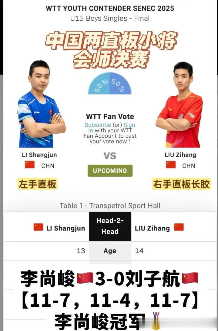 2025年11月,WTT青少年常规挑战赛塞内茨站赛场上,来自中国的少年李尚峻以七场全胜、仅丢五局的成绩夺得U15男单冠军。 在决赛中,他直落三局击败了刚获得U17冠军的队友刘子航。 这不是李尚峻首次在国际赛场证明自己,早在2025年3月,他就在WTT柏林青少年挑战赛上获得过同组别冠军。
