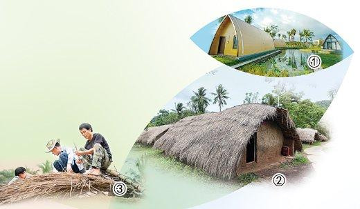 图(1):海南环岛旅游公路莺歌踏浪驿站的船型屋民宿。张茂摄图(2):白查村的船型屋。人民网记者孟凡盛摄图(3):白查村村民在修缮船型屋。周小凯摄