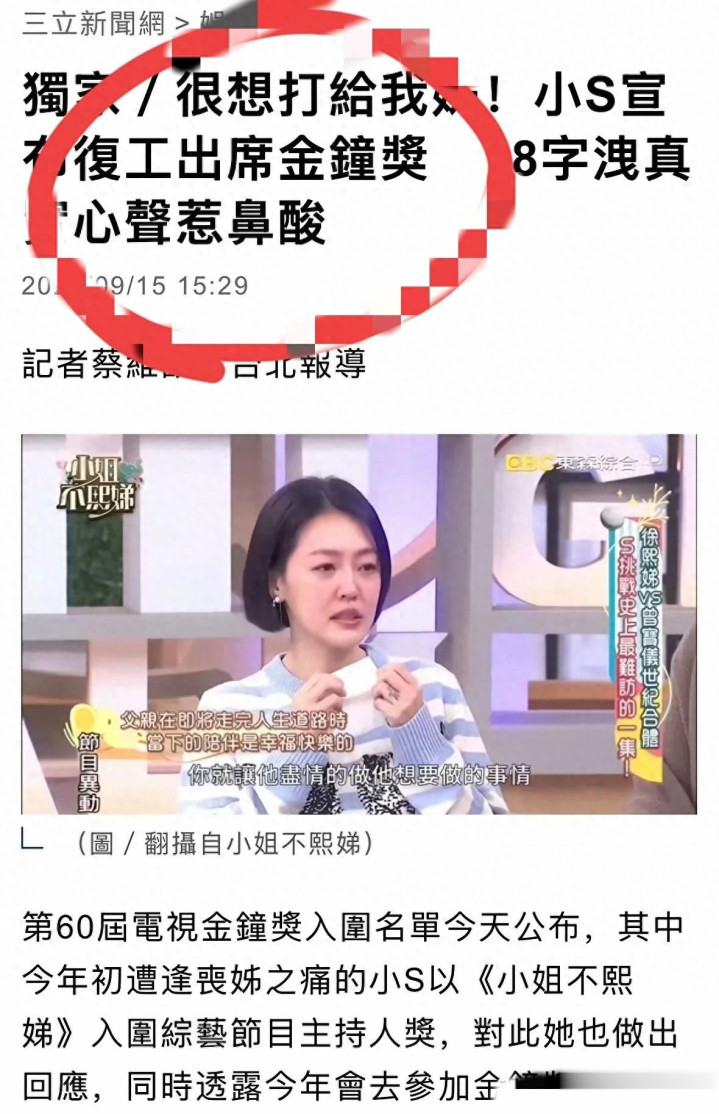 9月15日,台媒报曝光金钟奖入围名单,小S凭借《小姐不熙娣》入围主持人奖。这也是自从小S在失去姐姐之后,参加的首个公开活动,小S本人也作出了回应表示,将参加今年的金钟奖颁奖典礼。
