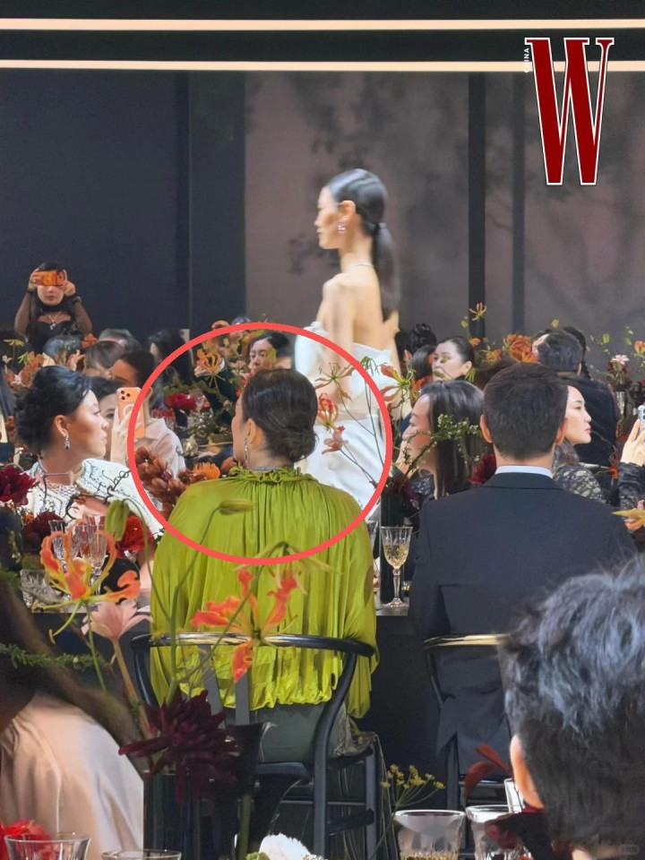 她坐在距离T台最近最好的观赏位置,从背后来看倒是没有正面照那么显老,利落优雅的盘发,堪称秒杀同桌所有女性。