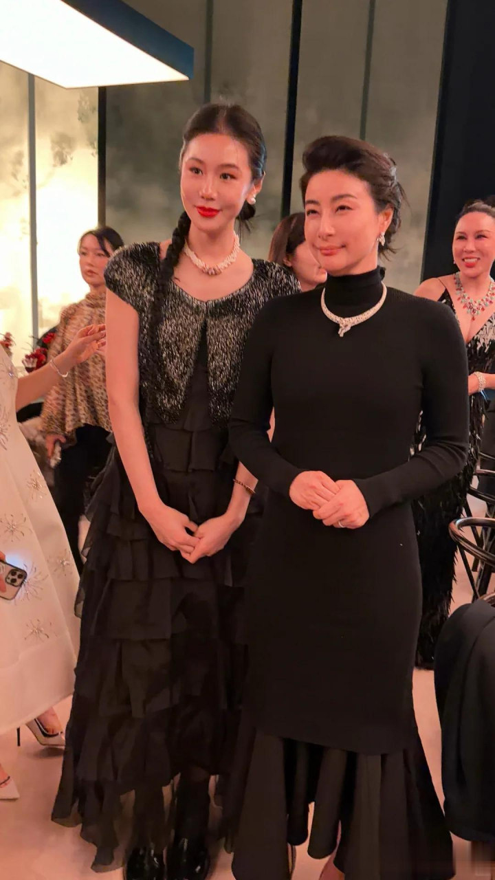 她穿着一袭高领黑裙把自己裹得严严实实,耳环是2019年香港赛马会戴过的旧款,胸针还是品牌早年VIP专供款。