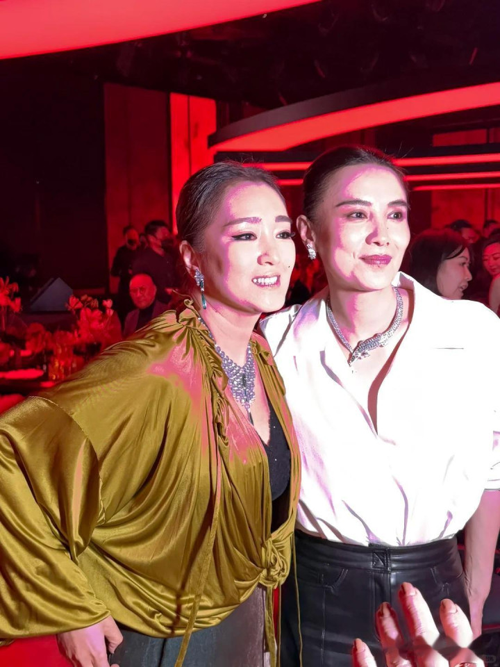 台下则一边是巩俐深V礼服配翡翠项链贵气逼人,一边是郭晶晶高领黑裙全裹出镜。