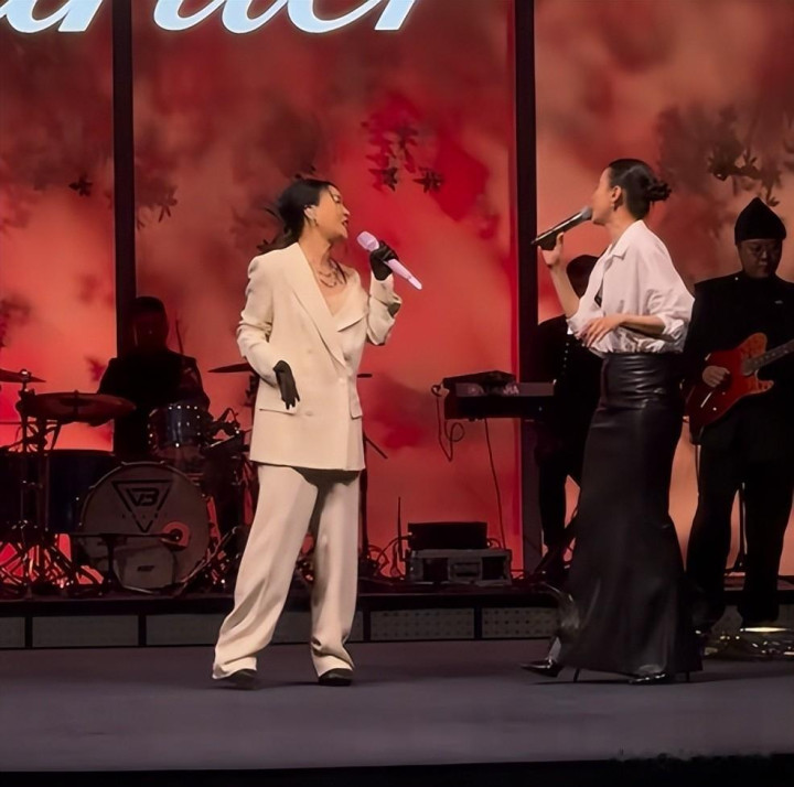 晚宴下半场,那英穿着白色西装套装突然带着乐队上台表演,演唱了《一笑而过》等好几首歌曲,瞬间吸引了全场的注意。