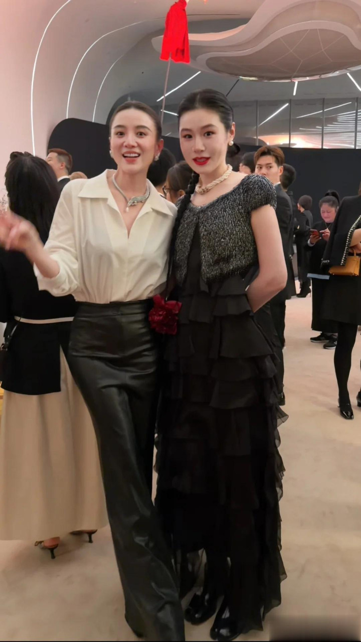 晚宴上换了白衬衫搭黑色长款皮裙,脖子上戴的鳄鱼造型项链,审美绝了,又飒又美,单看的话,还是很养眼的。