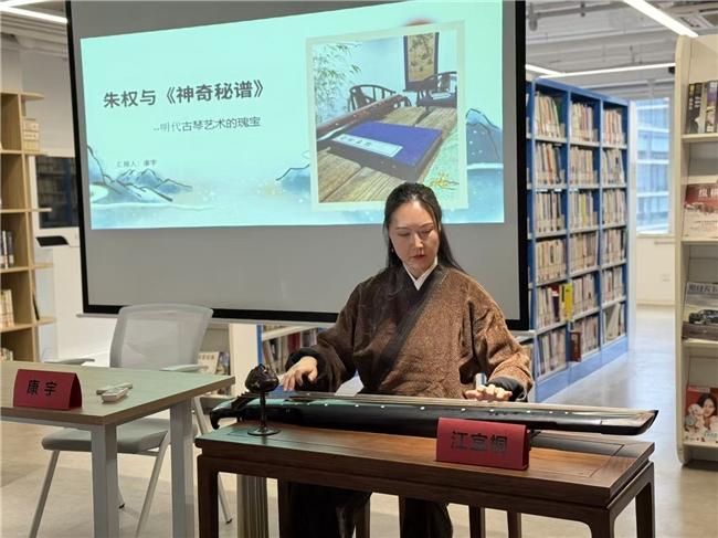 活动特别邀请古琴艺术非遗传承人江宜桐以一曲经典琴曲《关山月》拉开帷幕。悠扬的琴声在图书馆内缓缓流淌,时而高亢激昂,时而婉转低回,仿佛将观众带回那承载着家国情怀的岁月,瞬间点燃了现场的文化氛围与民族情感。