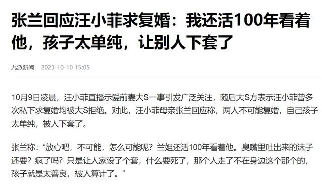 1、九派新闻(2023-10-10):《张兰回应汪小菲求复婚:我还活100年看着他,孩子太单纯,让别人下套了》