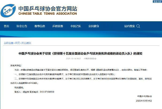 虎扑10月16日讯中国乒乓球协会发布《获得第十五届全国运动会乒乓球决赛优异成绩的运动员入队》的通知,全文如下: