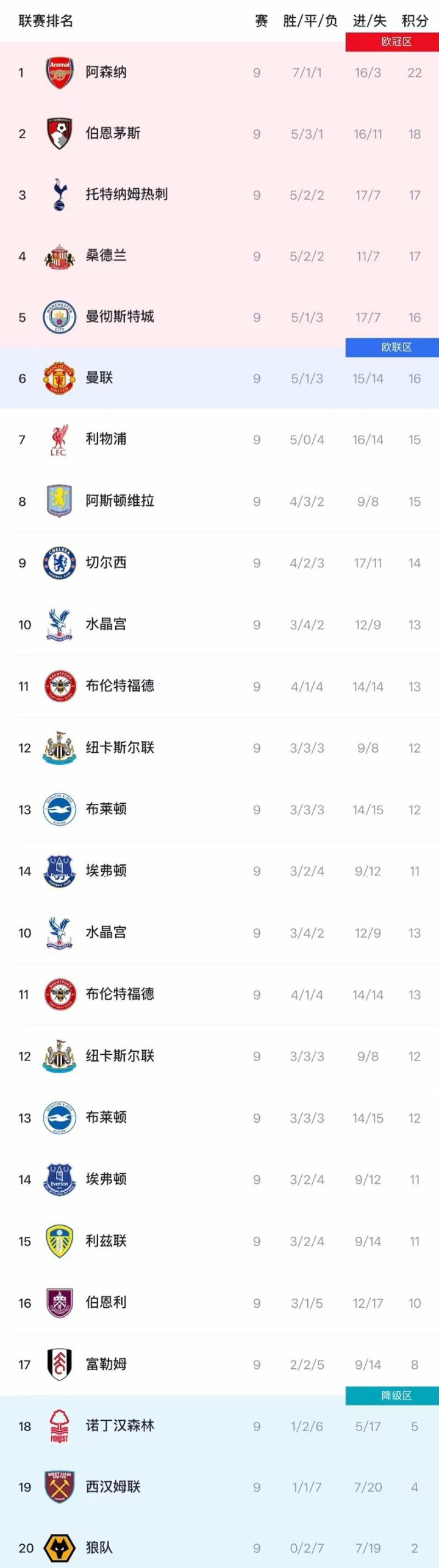 阿森纳在主场以1比0小胜水晶宫,凭借这场胜利,枪手以7胜1平1负积22分稳居榜首;伯恩茅斯本轮2比0击败诺丁汉森林,目前他们以18分暂列第二,仅落后阿森纳4分;热刺在客场3比0完胜埃弗顿,以17分升至第三,重新回到争冠集团。曼联4比2击败布莱顿,暂列第6名;切尔西主场1比2不敌桑德兰,仅列第9;利物浦客场2比3不敌布伦特福德,目前排名第7;维拉凭借击败曼城的关键胜利,积分追平利物浦,排名第8。