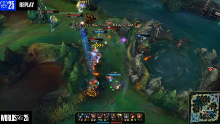 【25:59】Oner潘森开大精准找到deokdam吉格斯瞬间将其融化,上路Bdd斯莫德242层出山点掉Faker,KT打出1换2,T1经济领先6k。