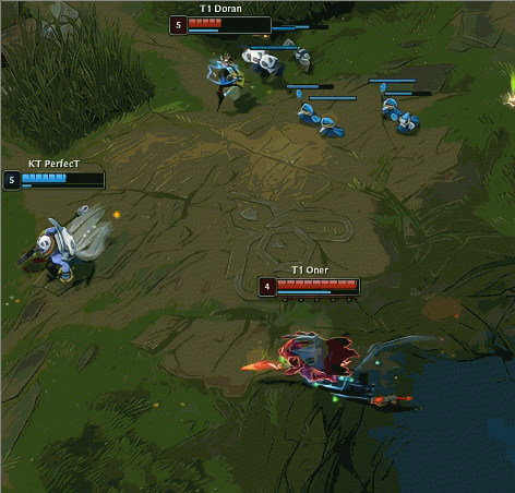 【5:05】Bdd斯莫德中路强行越塔击杀Faker,但被防御塔击杀,双方打出1换1。同时Oner潘森再去上路配合多兰卡蜜尔逮捕PerfecT掘墓。