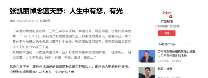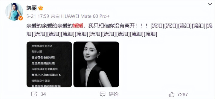 张凯丽得知后悲痛不已,并在自己的社交平台上深切怀念了与他合作时的点点滴滴。
