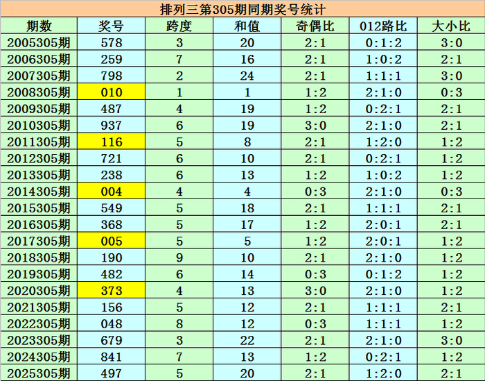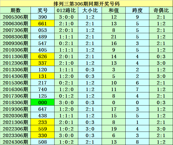 本期为排列三第2025306期开奖,开奖日期为:2025年11月16日,历史上排列三第306期已开出了20次奖号,历年同期开出号码分别为:390-661-053-489-547-405-626-337-120-131-217-740-125-000-647-438-233-559-330-508。