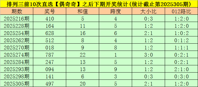 开奖回顾:排列三第2025305期开出奖号:497,类型为组六,和值为20,奇偶比为2:1,大小比为2:1,跨度为5。