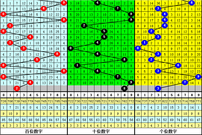 6.下期奖号0-9号码频次分别为:号码1、4开出6次;7开出4次;0、2、8开出3次;6、9开出2次;5开出1次;3开出0次。本期独胆参考3。