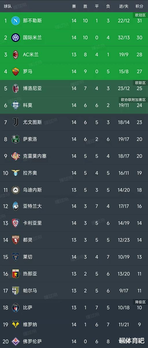 北京时间12月8日,意甲第14轮率先结束了7场比赛,我们一起看看最新积分榜变动!